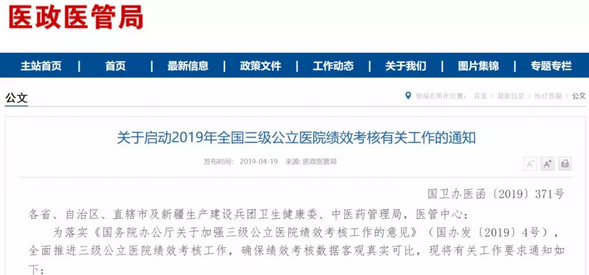 PRESS CENTENR4月19日,国(guo)(guo)家卫生健康(kang)委(wei)、国(guo)(guo)家中医(yi)(yi)药管(guan)理局联合(he)发布(bu)《关(guan)于(yu)启动2019年全国(guo)(guo)三级公立(li)医(yi)(yi)院绩(ji)(ji)效(xiao)考(kao)核(he)有关(guan)工作的(de)通知(zhi)》。《通知(zhi)》明确,将于(yu)今年6月1日开放全国(guo)(guo)三级医(yi)(yi)院绩(ji)(ji)效(xiao)考(kao)核(he)信息系(xi)统,所有三级公立(li)医(yi)(yi)院可直接上传(chuan)医(yi)(yi)院绩(ji)(ji)效(xiao)考(kao)核(he)数据。